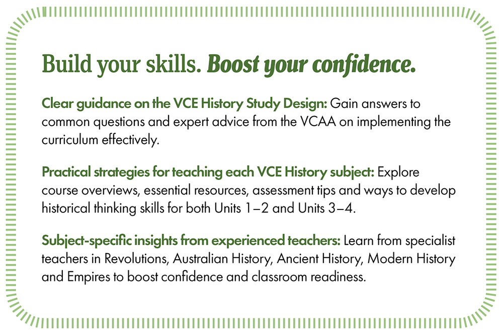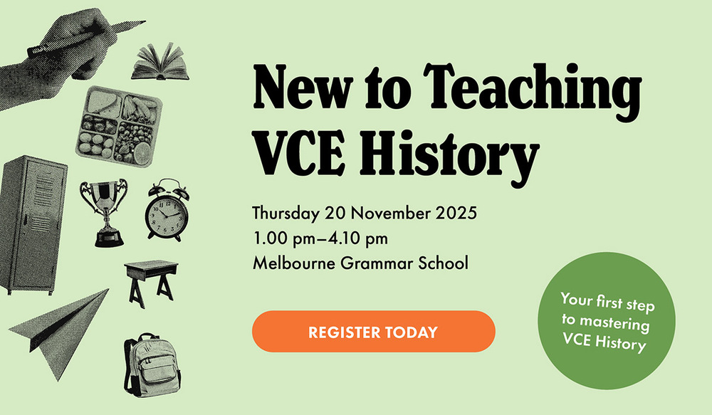 This event is aimed at pre-service teachers, teachers unfamiliar with VCE History or experienced teachers who feel they need more guidance with the Study Design. Participants will be advised on how best to prepare to teach Revolutions (Units 3 & 4), Australian History (3 & 4), Ancient History (1–4), Modern History (1 & 2), and Empires (1 & 2) in 2026.
