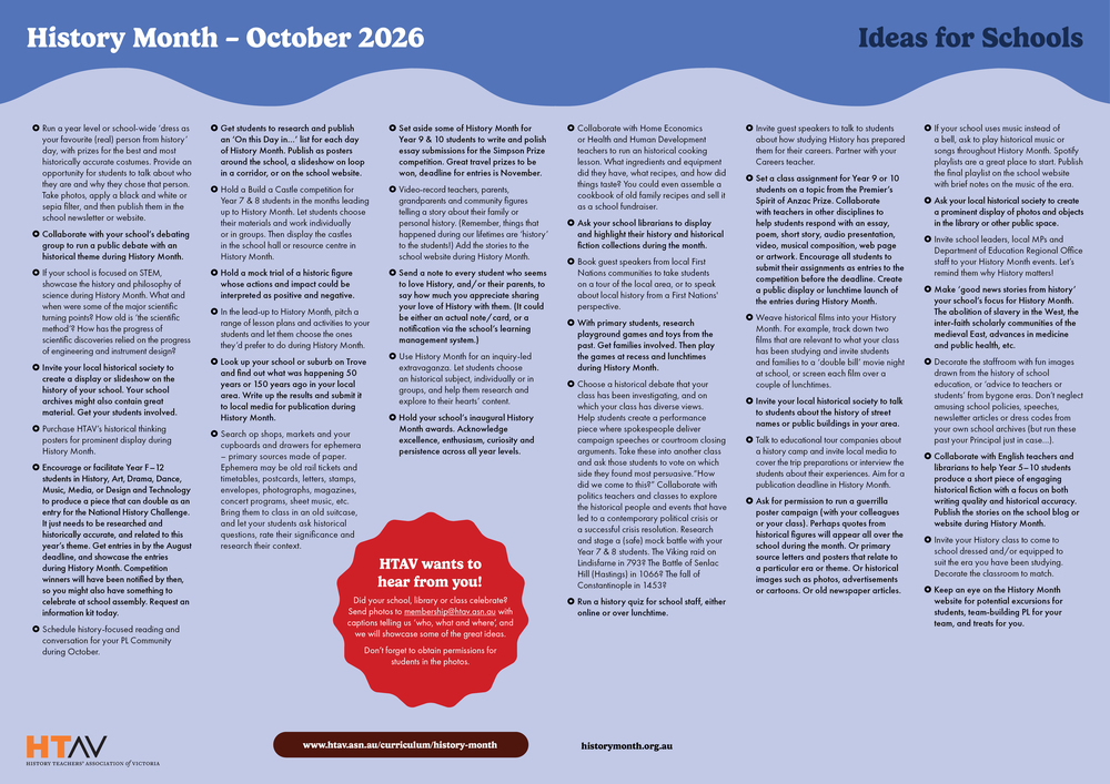 Let us know about how your school is celebrating History Month. Please send us a couple of photos to membership@htav.asn.au, with captions telling us the who, what and where, and we will showcase some of the great ideas in our next Member Bulletin and on the HTAV website.